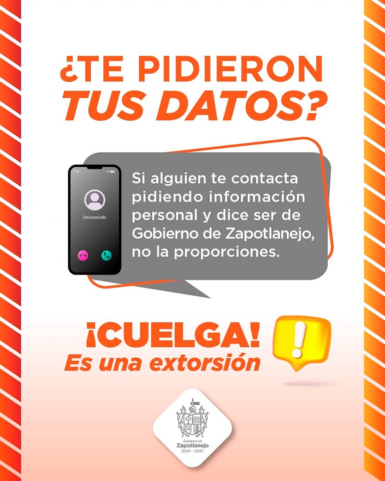 El Gobierno de Zapotlanejo informó a la comunidad que se presentaron reportes de llamadas de extorsión en las que diferentes personas se hacen pasar por funcionarios del gobierno municipal.